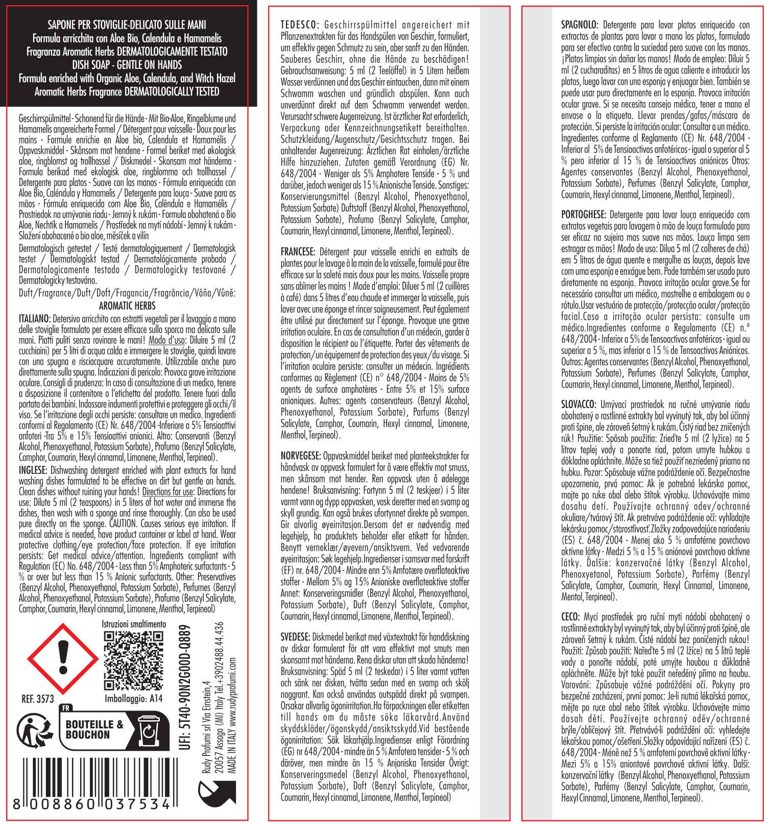 Discover Rudy's exceptional hand dishwashing soap, enriched with plant extracts, designed to be effective on dirt but gentle on your hands. Get impeccably clean dishes without compromising the care of your hands! This degreasing treatment turns dishwashing into a delicious experience. Enriched with natural extracts of Aloe Vera Bio, Witch Hazel Water and Calendula Water, its water-activated formula develops incredible degreasing power on dishes, glasses and crockery. Dermatologically tested, this soap cares for your hands, leaving them soft and pleasantly scented.