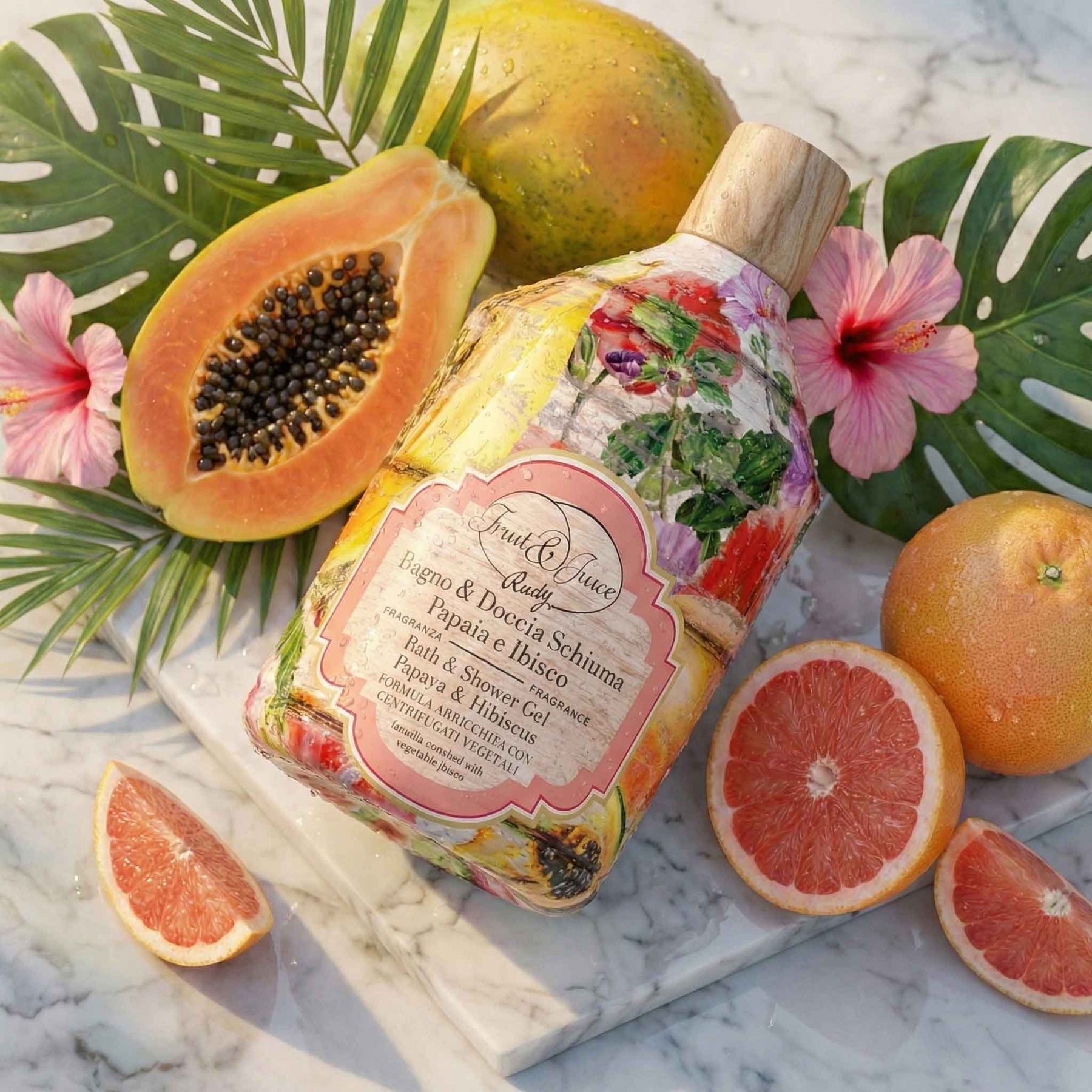 Papaya e Ibisco: fragranza solare e tropicale, con un’apertura energica di frutto della passione, papaya e pompelmo.